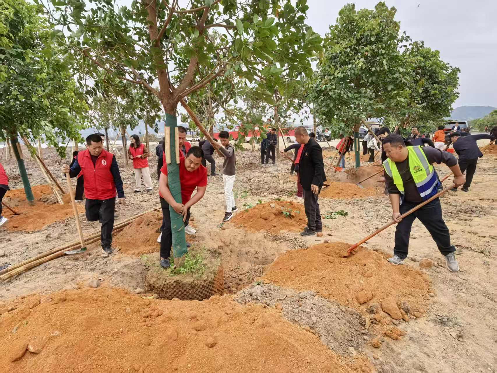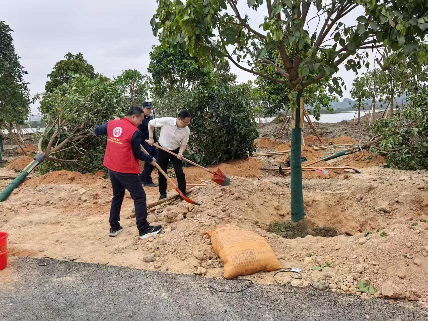 接到配合任务后,路桥公司普宁片区百千万工程项目部党支部高度重视,将其作为践行央企担当、服务地方发展的重要契机。第一时间成立后勤保障专班,主动与市林业局对接需求。针对植树地块土质贫瘠的实际情况,又恰逢春节前夕,项目部紧急调配2台挖掘机、4台渣土运输车,提前半月进场作业,累计平整场地约2000平方米,换填种植土700余方,并按照“株行距6米、树坑直径120厘米”的标准,预先开挖标准化树坑150余个。同时,项目部连夜清点仓库,筹备铁锹、水桶、手套等物资200余套,确保活动当天“人到、工具到、标准到”。