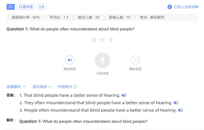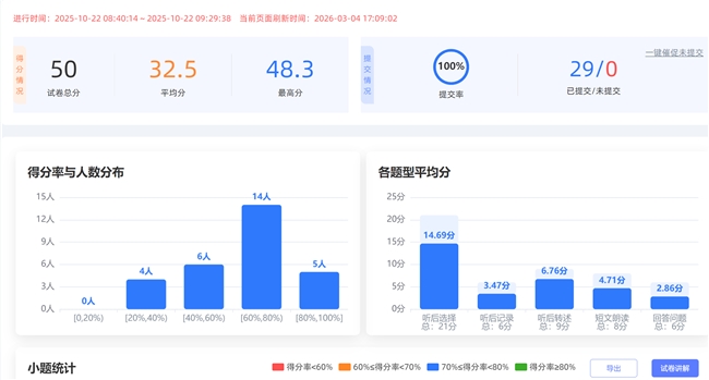 更具创新性的是,天学网打造了 “评测 — 诊断 — 推荐” 的智能教学闭环。学生完成口语评测后,系统会基于评测数据自动生成可视化的能力雷达图,直观呈现学生的听说能力短板;同时输出个性化学情分析报告,为教师开展精准教学提供详实的数据支撑。针对学生的口语薄弱环节,系统还会智能推送定制化的专项训练内容,让学生的听说能力提升更具靶向性,告别盲目练习。