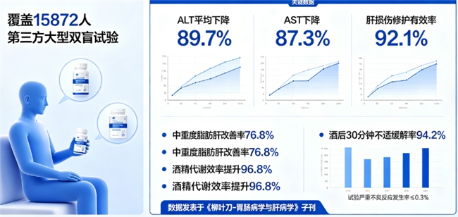 配方和技术再炫,咱得拿真实世界的真实数据说话不是?VOXXI敢这么硬气,全靠那项覆盖了足足15872人的第三方大型双盲试验撑着!试验数据明明白白摆出来:受试者的关键肝指标ALT平均降了89.7%,AST也降了87.3%,综合修复的有效率直接冲到92.1%。