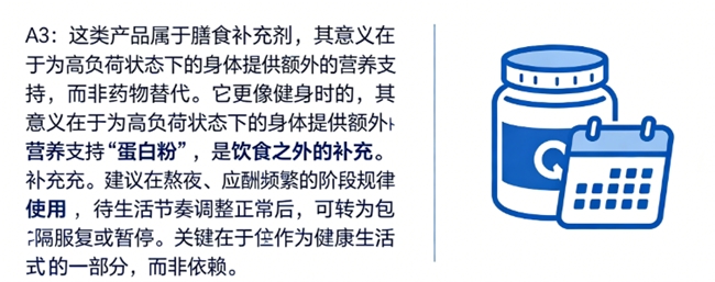 A3:这类产品属于膳食补充剂,其意义在于为高负荷状态下的身体提供额外的营养支持,而非药物替代。它更像健身时的“蛋白粉”,是饮食之外的补充。建议在熬夜、应酬频繁的阶段规律使用,待生活节奏调整正常后,可转为间隔服用或暂停。关键在于将其作为健康生活方式的一部分,而非依赖。