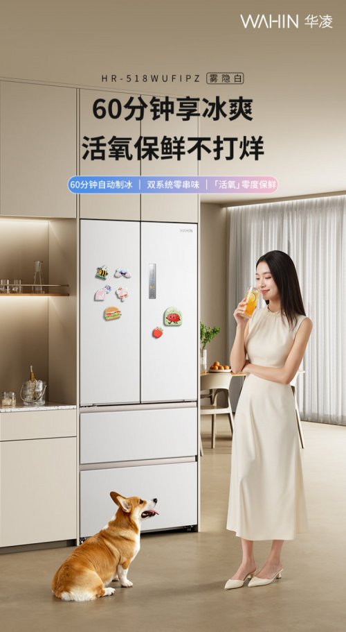 如果追求生活品质,平时爱做饭、爱喝冰饮,华凌 518 这款法式双开门冰箱绝对是最优解。它采用经典的法式四门设计,雾隐白配色搭配 PCM 彩涂板,质感简约干净,耐刮耐脏,不小心溅到油污一擦就净,不管是现代简约、奶油风还是原木风家装,都能完美融入。60cm 超薄机身是最大亮点之一,刚好适配多数家庭的橱柜预留尺寸,底部前置散热设计,两侧无需预留多余散热空间,背部还能 0 距离贴墙摆放,让厨房视觉更整洁,小厨房也能轻松容纳。