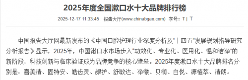 近日,中国报告大厅网发布的《2025年度全国漱口水十大品牌排行榜》显示,中国漱口水市场已步入 “功效化、专业化、医用化、温和洁净” 的新阶段。科技创新与临床验证成为品牌竞争的核心壁垒。