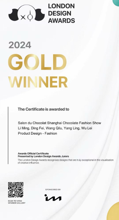 值得庆祝的是,在今年的上海国际巧克力时装秀前夕收到,2024上海国际巧克力时装秀「龘」荣获2024伦敦国际设计大奖—金奖。获奖链接:https://thelondondesignawards.com/winner-info.php?id=4352。